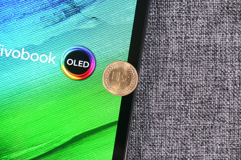 ASUS Vivobook 13 Slate OLED 採用窄邊框設計,左、右邊框的寬度連一元硬幣的一半都不到,不只大幅提高螢幕佔比,同時也縮小機身尺寸,讓使用及攜帶都更加方便。