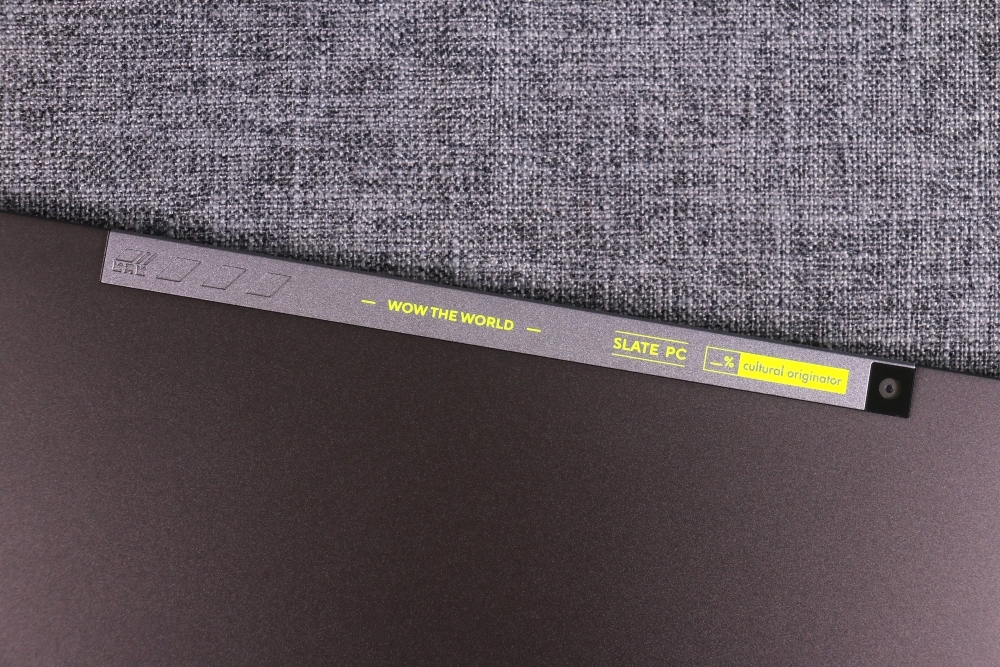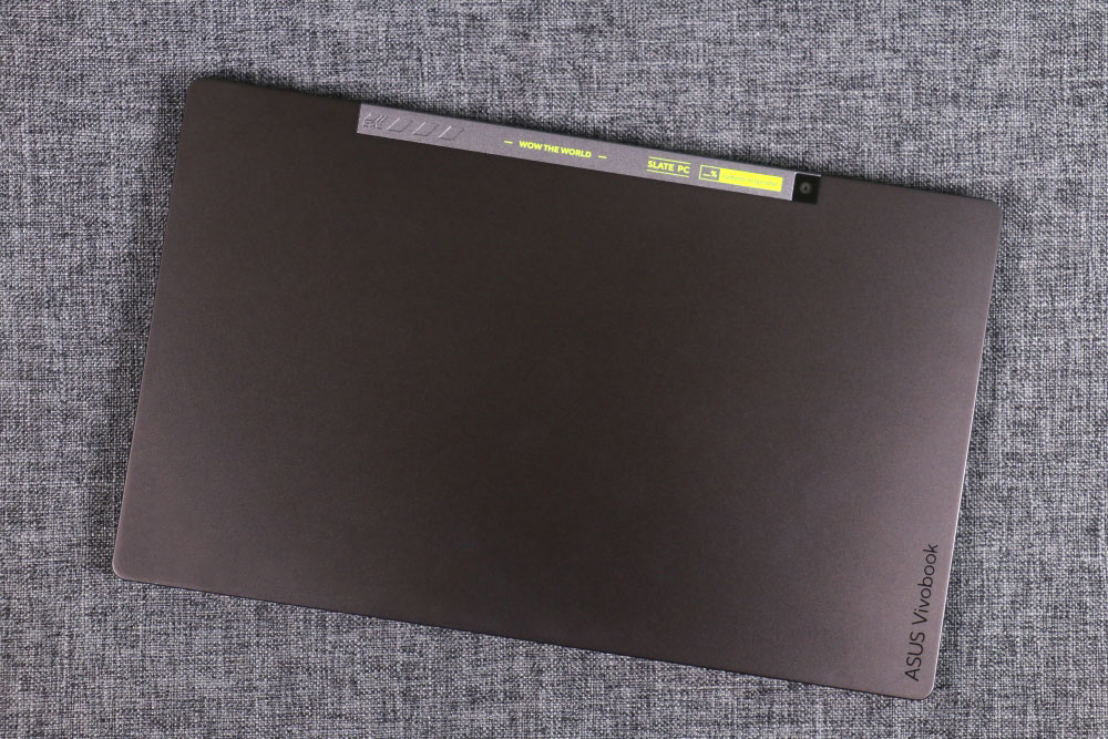 ASUS Vivobook 13 Slate OLED 的機身上有許多個性化裝飾,像背蓋上方這條灰色飾條,除了左側代表 Vivobook 的圖示之外,中間及右側還用上相對醒目的綠色字樣做妝點,讓整部 Vivobook 13 Slate OLED 更有個性。另外,1,300 萬畫素主相機設置在灰色飾條右側,可以用來拍攝文件、生活紀錄。