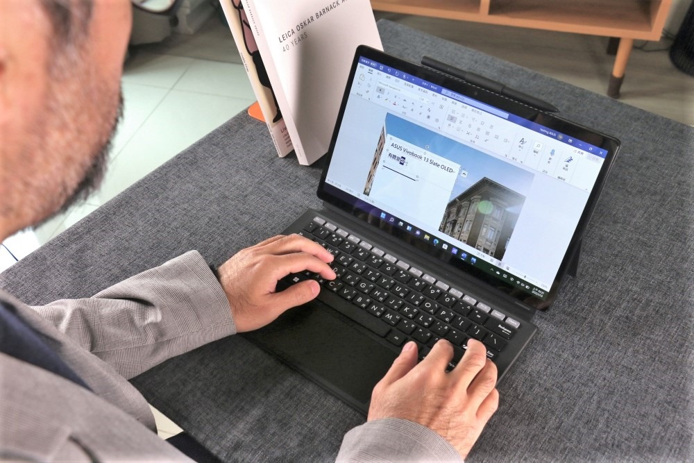 當支架保護套與磁吸可拆式鍵盤結合在一起,就能讓平板型態的 ASUS Vivobook 13 Slate OLED 搖身一變,變成適合辦公、文書作業的文書筆電了。值得一提的是,由於支架保護套擁有 170 度超大展開角度,比一般筆電螢幕的開合角度大上許多,且可無段式調整角度,無論是任何身形的使用者,都能輕易找到最適合自己的觀看角度,不只不用擔心坐姿的問題,長時間工作也會更加舒適。
