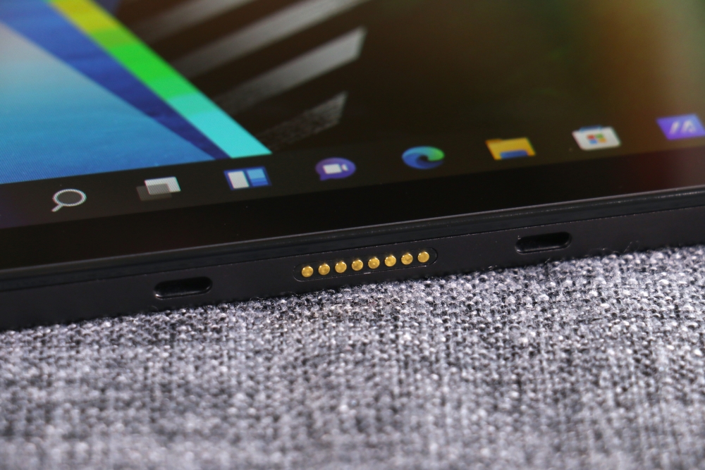 機身底部設有一個外接磁吸式可拆鍵盤的金屬接點,以及二個固定插槽。