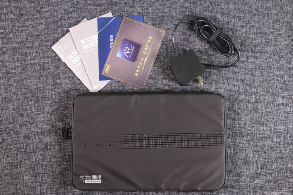 盒裝配件一覽,盒裝內除了磁吸可拆式鍵盤、支架保護套及 ASUS Pen 2.0 外,還另外提供數份使用及保固說明、一個 65W 充電器及一個專用的酷潮收納包。