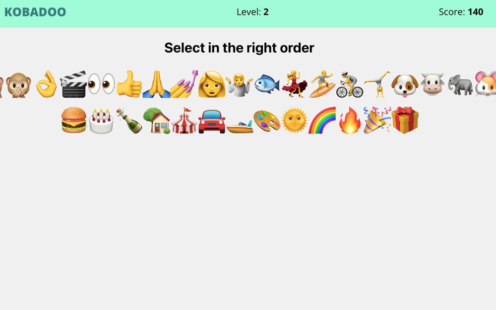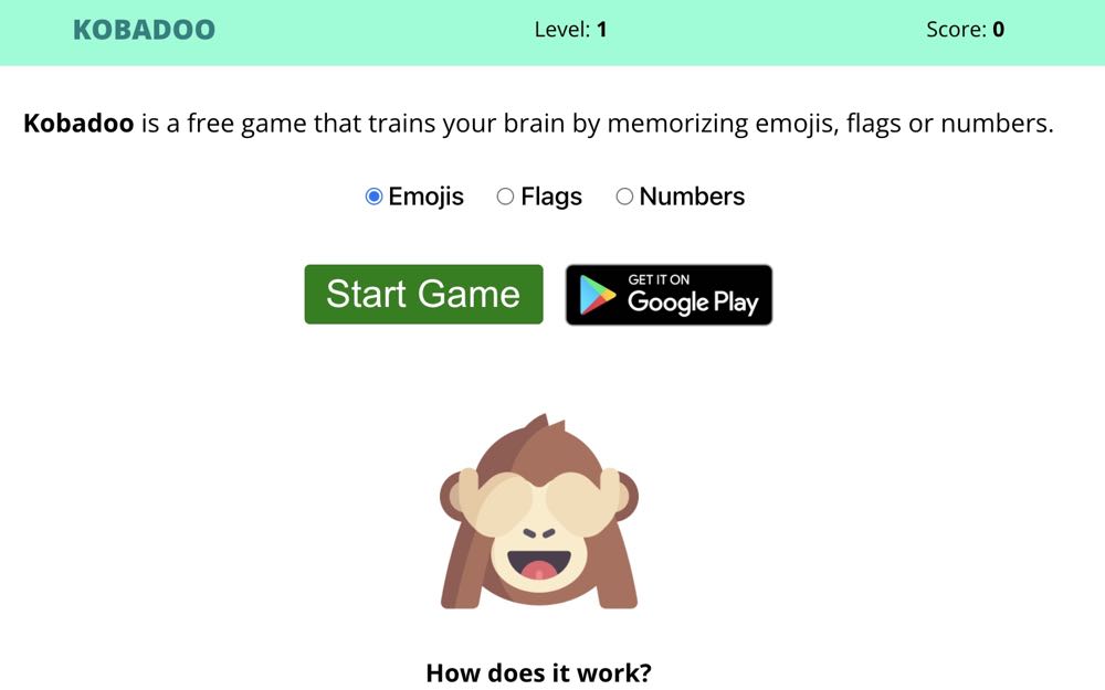 這款記憶遊戲名為「Kobadoo」,玩法很簡單,一開始可以選擇要使用「表情符號」、「國旗」或是「數字」來進行挑戰。遊戲中會開始陸續出現圖片,然後換我們依序把出現的圖案點選出來,從一開始的 2 個,慢慢的增加數量,越來越有挑戰性。