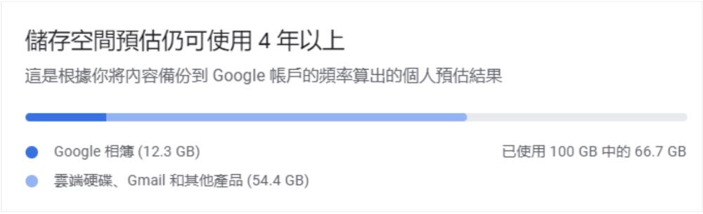 Google 相簿的「管理儲存空間」工具,讓使用者可以查看剩餘的儲存空間容量,也能看到根據過往備份習慣推估儲存空間將在多久之後用盡。儲存空間管理工具現已能在電腦、Android 及 iOS 裝置上使用。