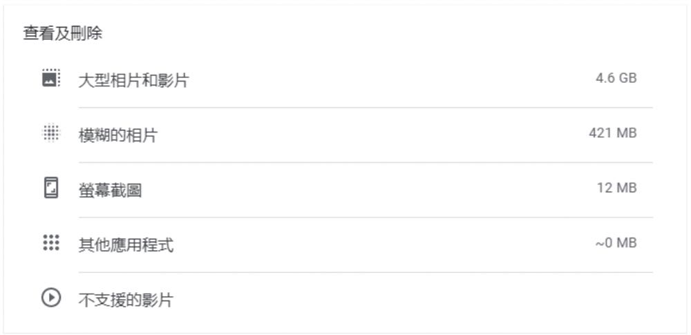 有時候拍照難免會失手,相簿中儲存了許多光線太暗、糊掉的相片和影片,以及為了快速分享給親友而截圖或螢幕錄影的檔案。這些相片和影片在日後不一定派得上用場,卻往往因為麻煩或忘記而沒刪掉佔據雲端儲存空間。「Google 相簿設定」內的「管理儲存空間」下,有「查看及刪除」選項,該選項會顯示大家較常刪除的相片及影片類型,透過 AI 分類出大型相片和影片、模糊的相片、螢幕截圖、其他應用程式、不支援的影片格式等,只要點選這些分類,使用者就能一次瀏覽相關類型的檔案,決定是否刪除,而無須從頭到尾瀏覽每一張相片及影片,省下大量時間。