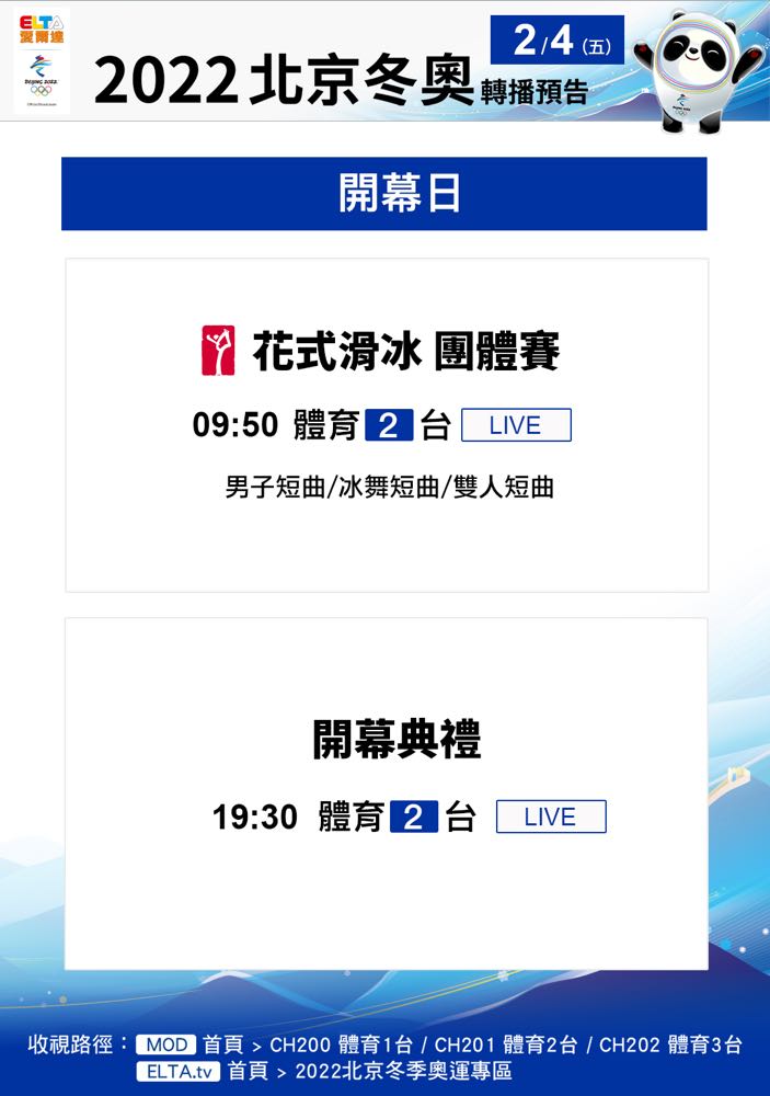 冬奧轉播節目表查詢:https://reurl.cc/QjEDYq