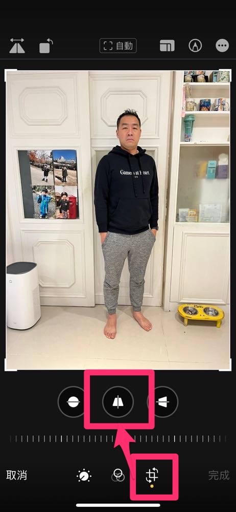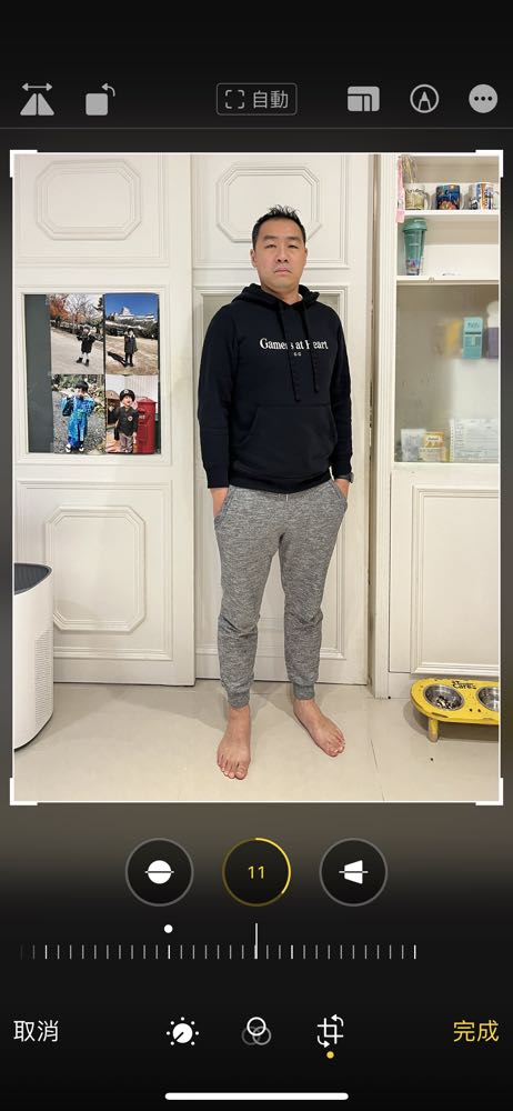3) 這時選擇中間那個「垂直校正」的圖案,開始調整數字。這邊我們直接把數字拉到 11 ,就會發現照片中的腿自然又神奇的長高了!