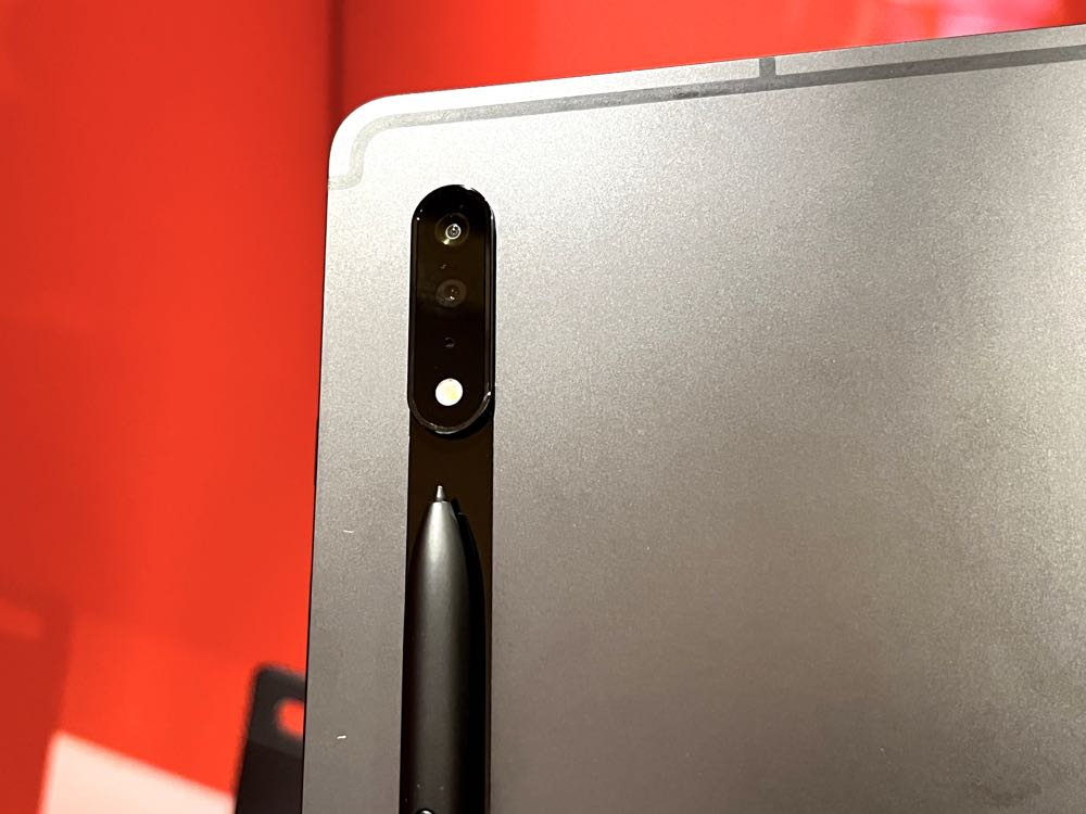 這次 Galaxy Tab S8 系列中最大成員 Tab S8 Ultra 規格為 14.6 吋 Super AMOLED 螢幕、 2960×1848 解析度,螢幕更新率為 120Hz ,後置 13MP 主鏡頭與 6MP 超廣角雙鏡頭配置、前鏡頭為 12MP 廣角 + 12MP 超廣角鏡頭雙前置鏡頭,也是三款中唯一有著瀏海螢幕。