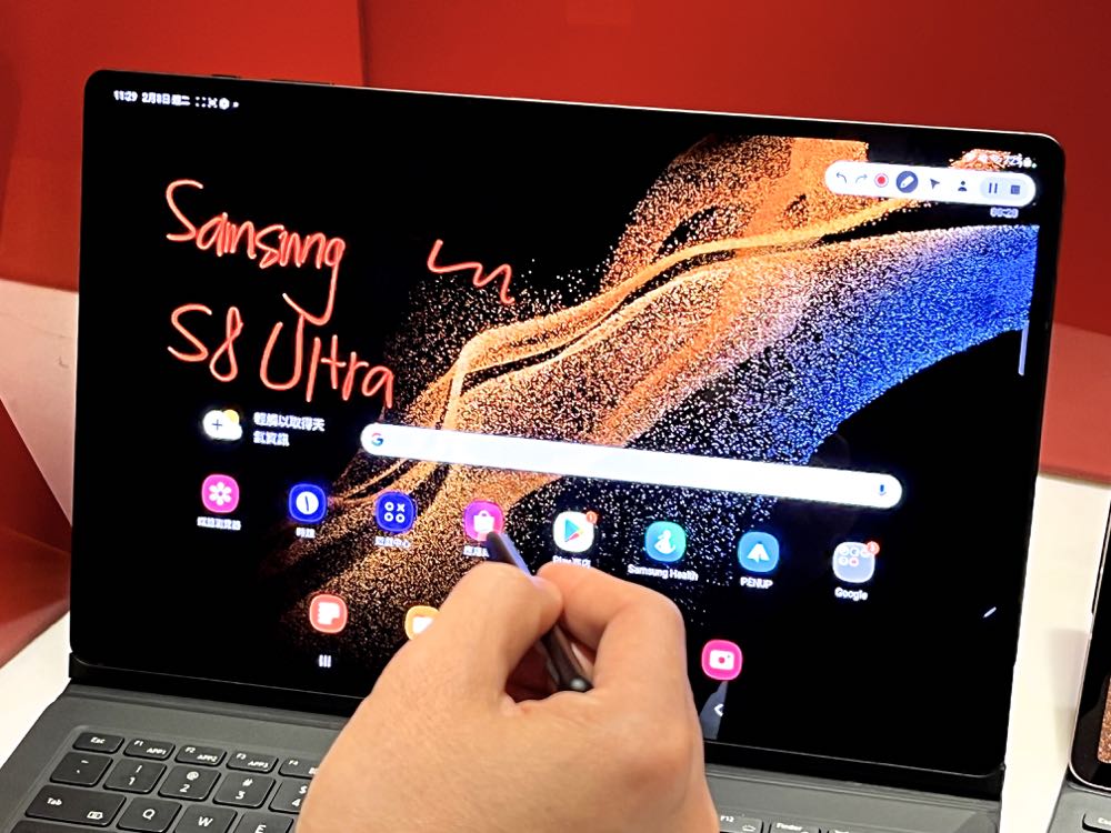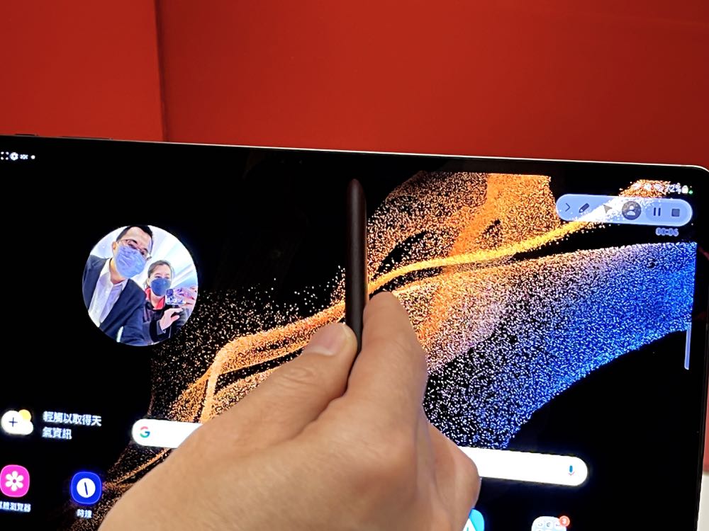 Galaxy Tab S8 系列在功能方面也加入了相當實用的「螢幕錄製」特色。只要在快捷鍵中選擇「螢幕錄製」,便能選擇使用平板本身的麥克風來做指向收音。也就是說平板會自動判斷選擇距離聲音最近的麥克風來進行錄音的動作。用戶則能用子母畫面開始進行畫面錄製、用 S Pen 在螢幕錄製過程中 輔助筆記進行說明。