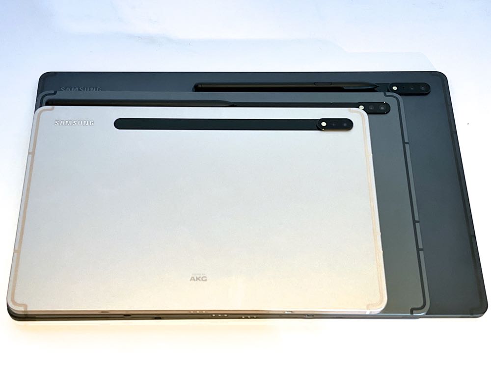 簡單來說,三款平板除了大小的差異,就是最大的 Tab S8 Ultra 有著雙前置鏡頭、多了一顆麥克風; Tab S8 / Tab S8+ 多了銀色跟玫瑰金 2 色。