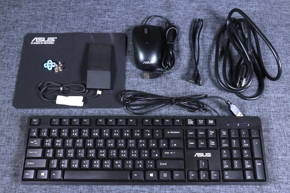 盒裝配件一覽,除了 ASUS S700TC 桌機外,還另外提供滑鼠、滑鼠墊、電源線、無線網卡接收器、鍵盤、螺絲及相關線材。
