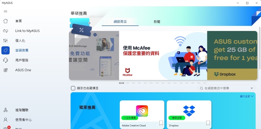 「華碩推薦」是 MyASUS 中一個非常實用的項目,在這個頁面裡可以看到網路商店正在推薦的實用軟體,也可以在新聞頁面中看到最新的品牌新聞,讓使用者可以輕鬆獲取最新資訊。
