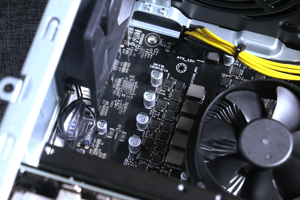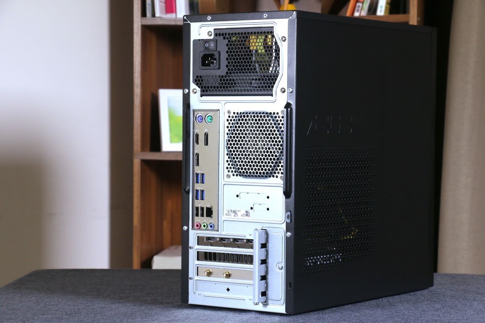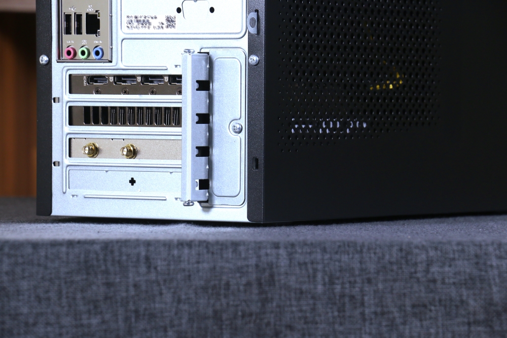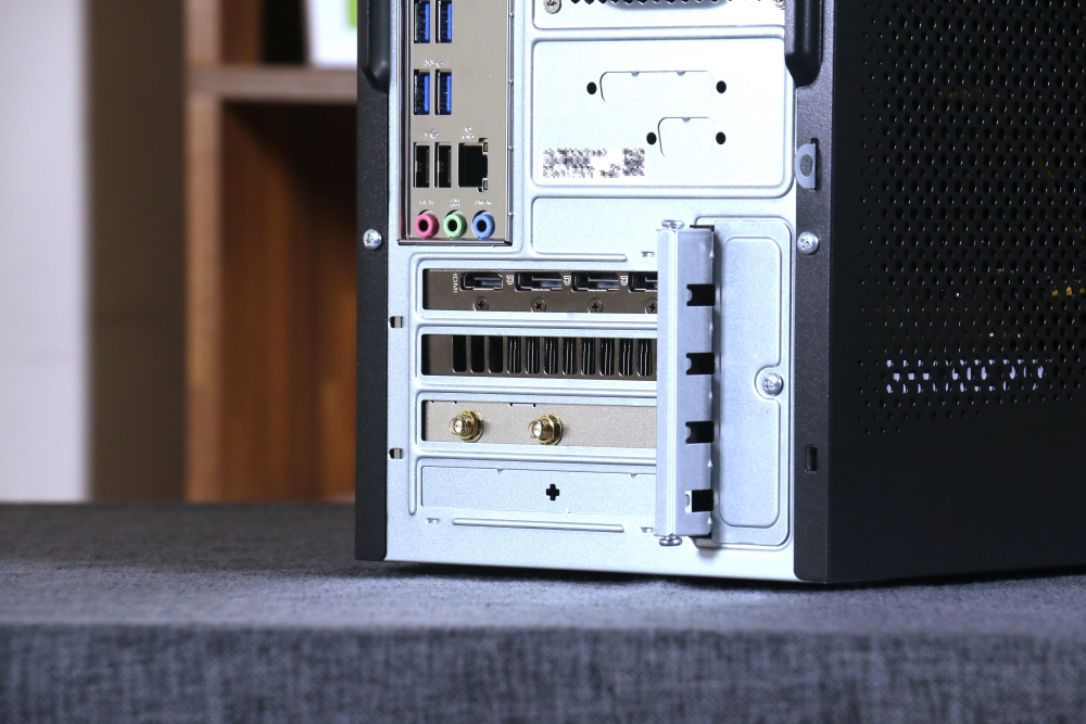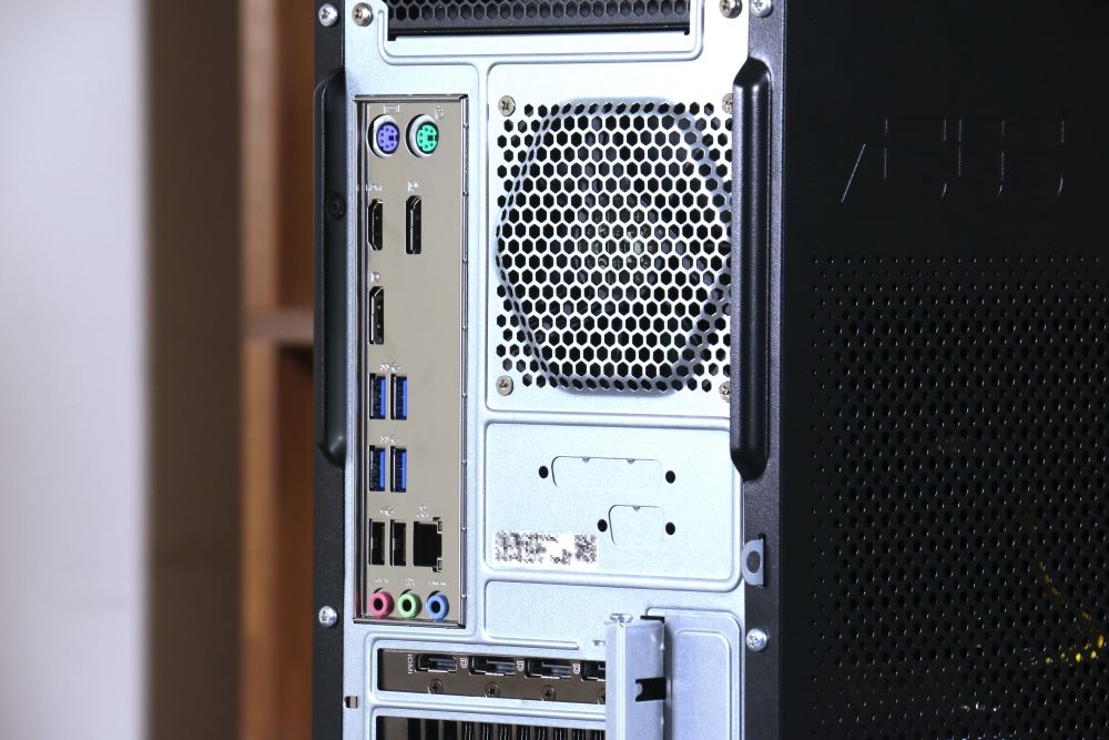 背面中間擋板設有多個 I/O,由上至下分別是一組 PS/2 鍵盤與滑鼠連接埠、一個 HDMI、二個 Display Port、四個 USB 3.2 Gen 1 Type-A 連接埠、二個 USB 2.0 連接埠、一個 RJ-45 網路連接埠,以及三個音源孔,散熱風扇則是設置在擋板右側。