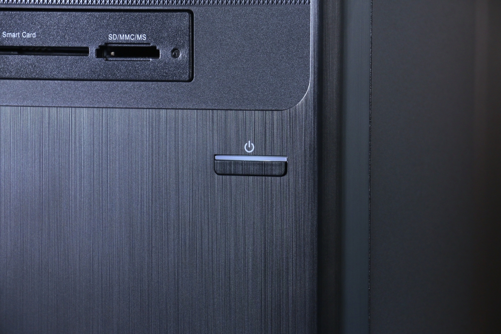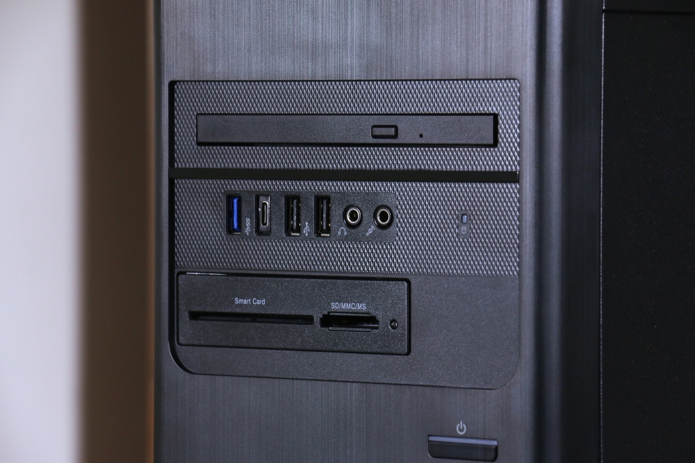 光碟機下方配備一排常用 I/O,由左至右分別是一個 USB 3.2 Gen1 Type-A 連接埠、一個 USB 3.2 Gen 1 Type-C 連接埠、二個 USB Type-A、一個耳機孔以及一個麥克風孔。另外,常用 I/O 下方還可選配智慧卡讀卡機和 SD 卡讀卡機,讓資料傳輸或其他相關應用更加方便。