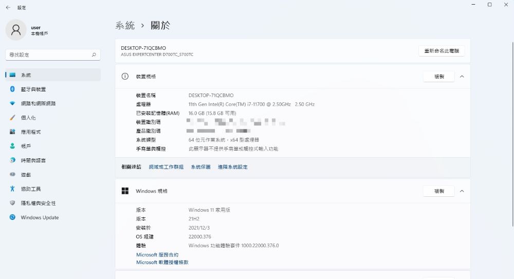 這次評測的 ASUS S700TC 內建 Windows 11 Home 作業系統、第 11 代 Intel Core i7 處理器以及 最高NVIDIA GeForce RTX 3060 獨立顯示卡 (或可另外選配 NVIDIA RTX A2000 顯示卡),機身上貼有對應貼紙,可直接知道配備哪些硬體規格。