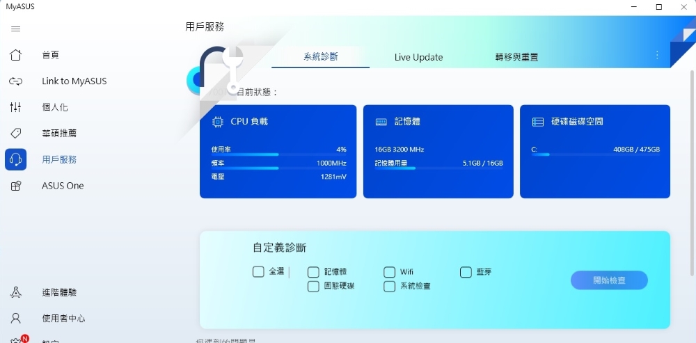 用戶服務分為系統診斷、Live Update、轉移與重置三個項目,系統診斷顧名思義就是可以診斷硬體上的問題,比方說出現過藍底白字、系統運作緩慢、無線網路連線問題…等,都可以透過系統診斷來排除;Live Update 是針對軟體更新服務,有最新版本都會在這裡顯示;轉移與重置則是針對資料轉移或是系統重置而設計,方便使用者備份或重置電腦。
