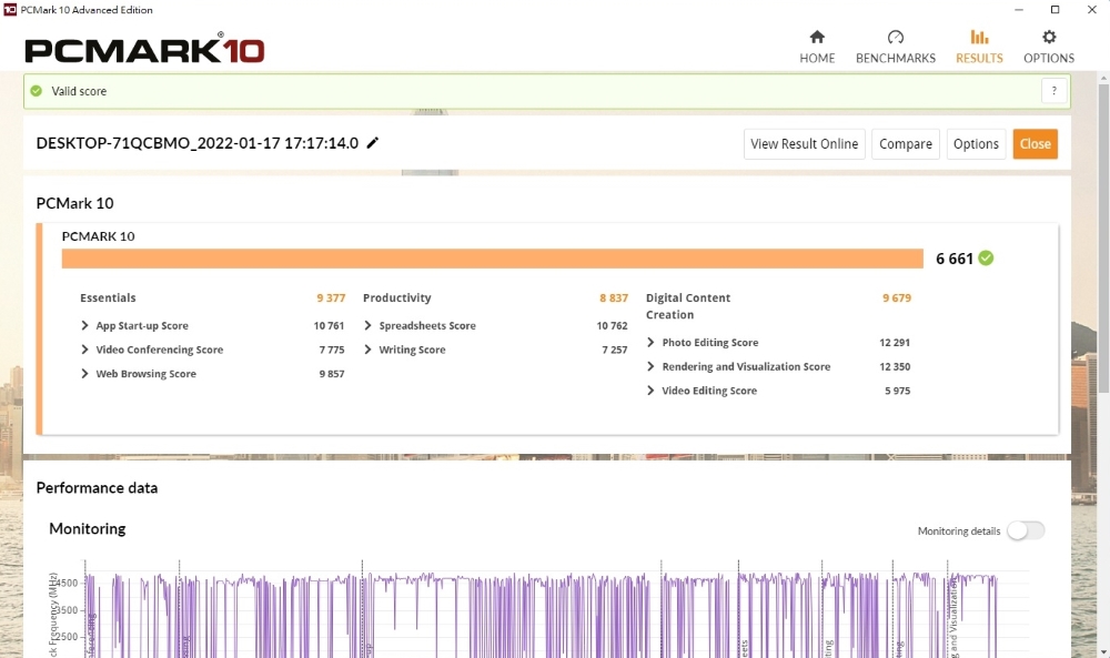 此台 ASUS S700TC 測試機台配備第 11 代 Intel Core i7處理器、16GB 記憶體的,其效能表現非常出色。經跑分軟體 PCMARK 10 的實測,測得 6,661 分的綜合分數,細項分數則是 Essentials 9,377 分、Productivity 8,837 分及 Digital Content Creation 9,679 分,整體表現非常出色,不管把它當作工作電腦還是家用電腦,都能順暢的執行各種應用。