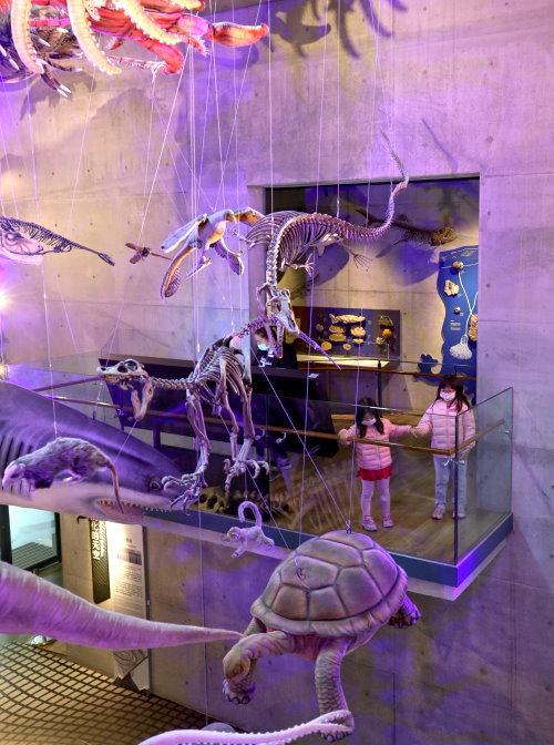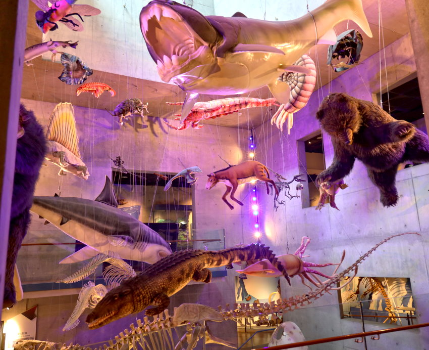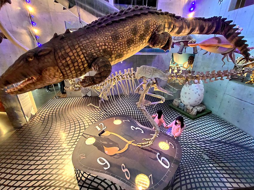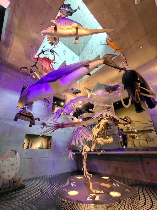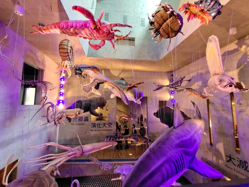▼這一區則是讓大家回到地球形成之初,從海洋生物的搶灘戰,到曾經稱霸地球的恐龍威風,接著就是哺乳動物的崛起與興盛,與史前人類的發展,彷彿見證一場活生生的地球生物演化史,整個很有身歷其境的感覺啊~~尤其這個天井更是展示了史前到現今的生物代表,不僅很壯觀,同時也是IG拍照打卡的熱點唷!