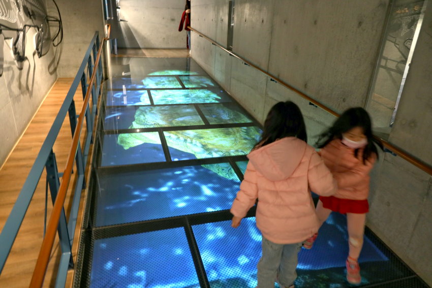 ▼互動廊道~~走在上頭不時還會有鱷魚張開大嘴,小口愛還被嚇了好大一跳呢!