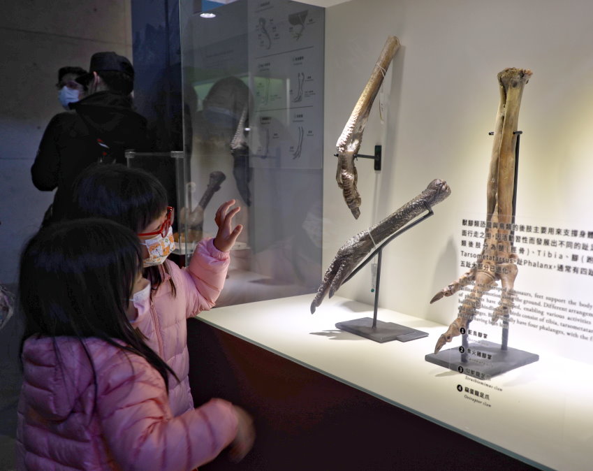 ▼還有鳥類、恐龍的腳掌足爪,小倆口很好奇的東看看西看看~~大一點的孩子可以看一下介紹或是聽導覽更清楚!