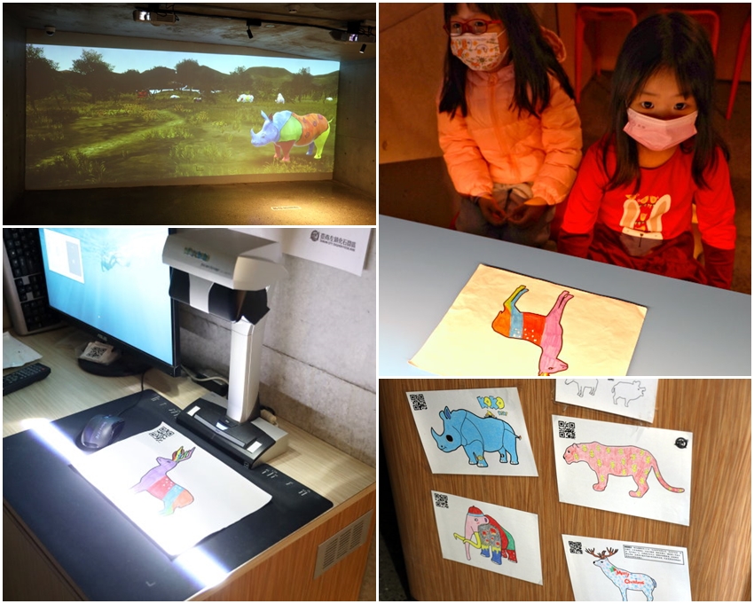 ▼一樓的探索教室也可以讓小朋友來為自己喜愛的動物著色,還可以投影到螢幕上頭去互動拍照、觸控餵食等,也是小朋友很愛的活動之一!目前體驗費用一組是100元,會附上一組蠟筆、兩張動物圖畫紙與園區吉祥物貼紙兩張,或是憑當天紀念品消費100元發票也可免費體驗一次!