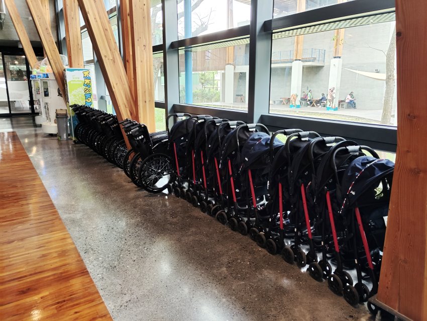 ▼服務台也有提供推車、輪椅可供租借,憑證件就能免費借用;這裡也有提供語音導覽機,但防疫期間暫停租借,大家也可以下載互動APP讀取更方便!
