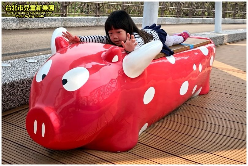 ▼最後我們又繞道三圈補玩了幾樣,之後就沿著天空步道走下來,沿途也有不少提供休憩的飛天豬造型座椅,小口愛很喜歡還趴在上頭拍照呢!