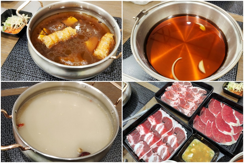 ▼湯頭有壽喜燒鍋、北海道昆布鍋、蔬果豚骨鍋、川味麻辣鍋(+49元)、韓風部隊鍋(+49元)、起司牛奶鍋(+49)等六種,我們五個人選了壽喜燒、昆布鍋、豚骨鍋、麻辣鍋等四種湯頭,口味都還不錯!
