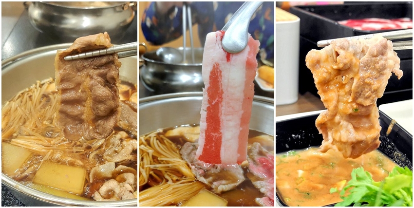 ▼板腱牛稍微涮個幾秒即可,吃起來帶點嚼感與肉香,搭配壽喜燒湯頭甜甜的還不錯!不過我們還是比較喜歡油脂豐富的牛五花、豬五花及耐煮的豬梅花,重口味的朋友還可以搭配醬料更加提味解膩!