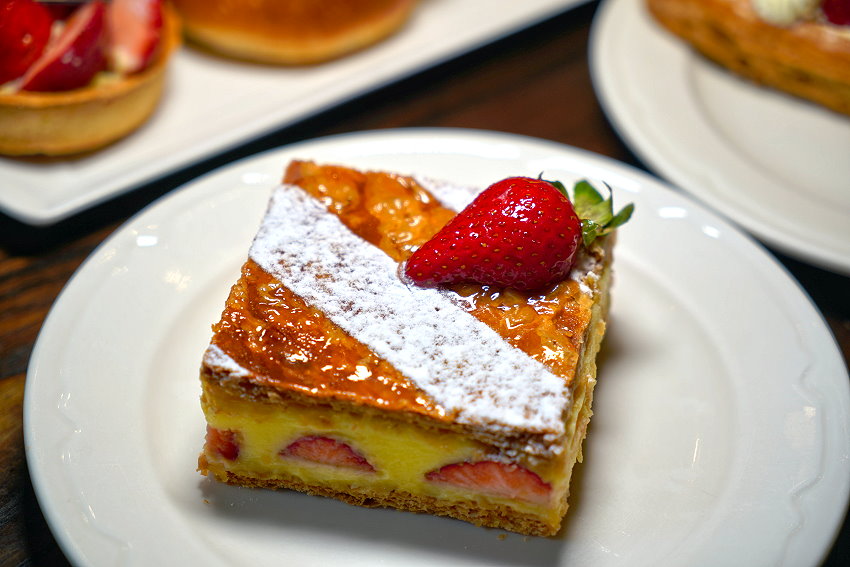 ▼還有超經典的「草莓千層塔」、「可娜麗」也是我們每回必吃的經典,此外也有藍莓塔、蘋果芙朗塔、鮮奶吐司、芝麻吐司等,不管是甜點、麵包的選擇都不少,光是站在櫥窗前就讓人有嚴重的選擇困難啊!