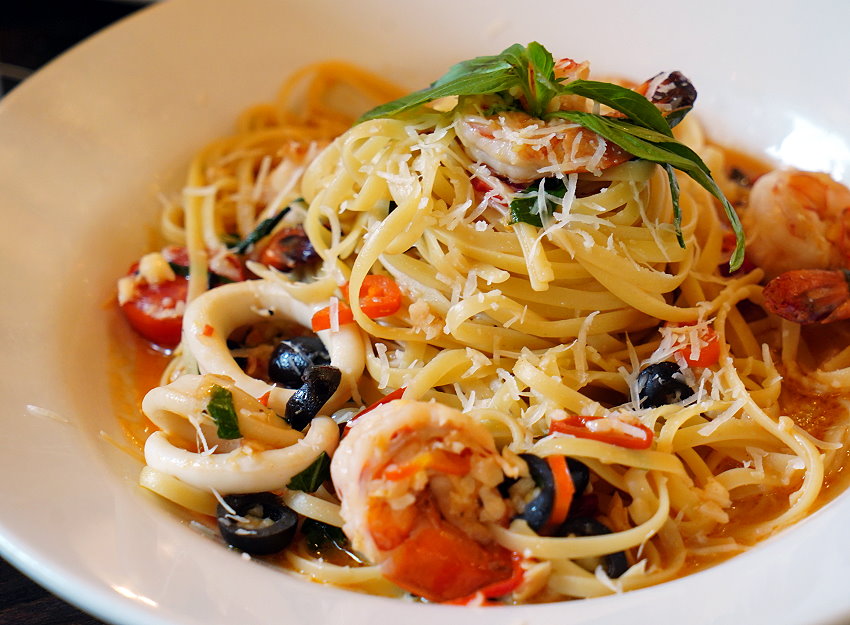 ▼裡頭有鮮蝦、花枝、白酒、黑橄欖、小番茄、蒜仁、紅辣椒、九層塔等配料,上桌前再刨上乳酪絲點綴,光看就很迷人!