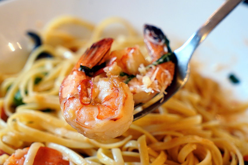 ▼先來填飽肚子再來享用美味的甜點吧~~我們點了鮮蝦蒜香白酒義大利麵,也是相當經典的一道熱銷餐點!