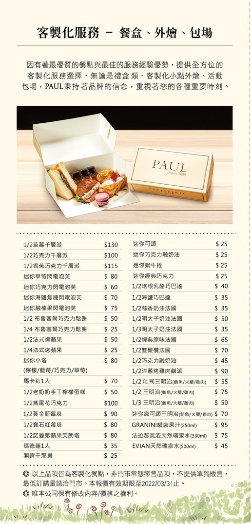 源自1889年法國巴黎的百年法式麵包、甜點店「PAUL 法國保羅麵包」深受不少台灣朋友喜愛,大口也吃過好幾次,最愛他們家的早午餐、可頌麵包跟可娜麗;最近草莓季更是推出不少由大湖草莓做成的法式創意甜點,不管是華麗造型還是酸甜味蕾都讓人少女心大開,草莓控一定不能錯過,很適合三五好友聚會,或是夫妻、情侶、姊妹、閨蜜來個美好下午茶約會;此外也有推出客製化Paul餐盒,像是下午茶餐盒、會議餐盒、點心餐盒等都是不錯的選擇,店內經典的鹹食甜點都能一次滿足,不管是野餐、露營、活動、包場、外燴等都很適合,只要12組就能訂購,也能依照預算與個人喜好來訂製唷~~方便又好吃!
