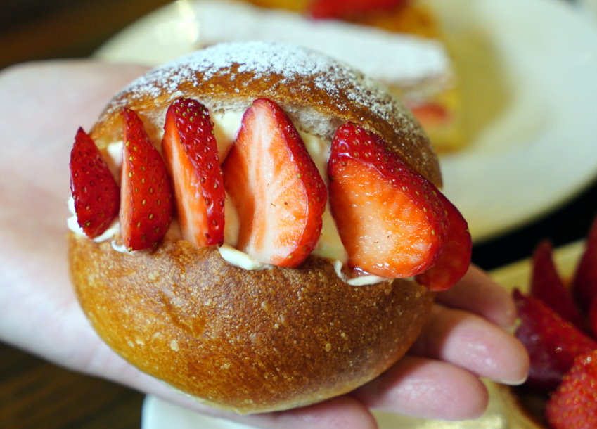 ▼莓好時光生乳包,造型渾圓可愛的生乳包夾入新鮮草莓切片,看起來更療癒了~~也是IG打卡的超夯美食啊!採用法國軟麵包為基底,夾入生乳內餡、新鮮草莓切片,帶點嚼感的麵包吃得到迷人香氣,加上滑順內餡與甜美草莓,口感層次頗為多元!