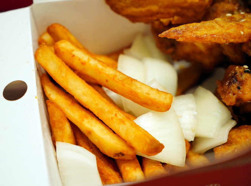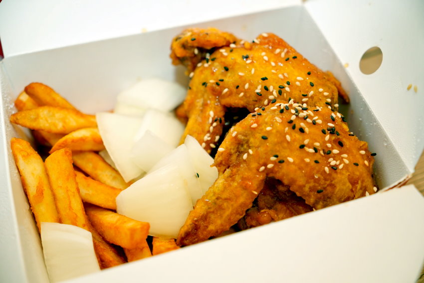 ▼棒棒腿x3、雙節翅x3,店員推薦我們可以選醬油口味,裡頭還附有薯條、洋蔥,吃起來豐富又有飽足感!