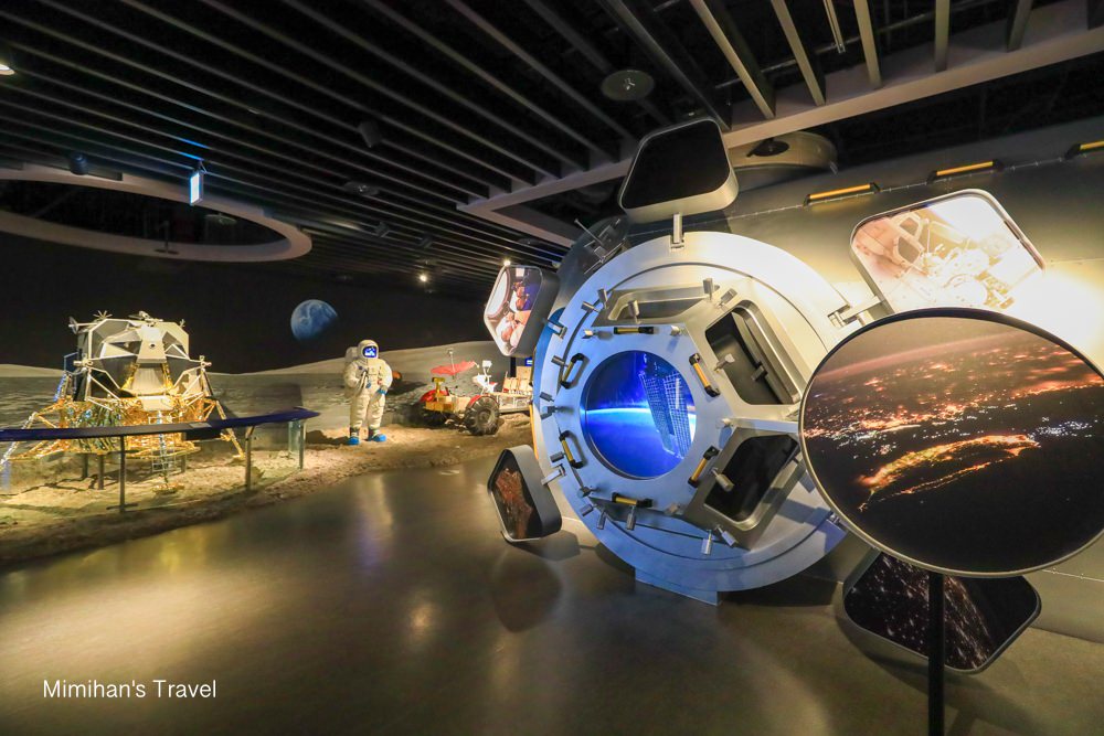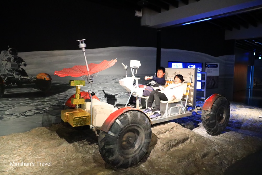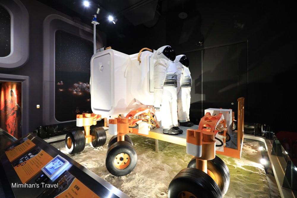 走進太空探索區,可以看到人類進行阿波羅登月計畫的景象,包含月面車、陀螺椅、太空衣、太空梭座艙、太空人生活等,小朋友還可以真的坐到月面車上拍拍照唷!