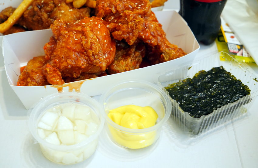 ▼我們訂的是升級版的半半炸雞(629元),可以任選兩種調味炸雞,部份口味炸雞需要額外加價;像我們點的是甜辣洋釀、蜂蜜蒜脆薯(+40元),一旁附有小瓶可樂、醃蘿蔔、蜂蜜芥末醬、韓式海苔等,我們兩大一小吃起來還滿剛好的!