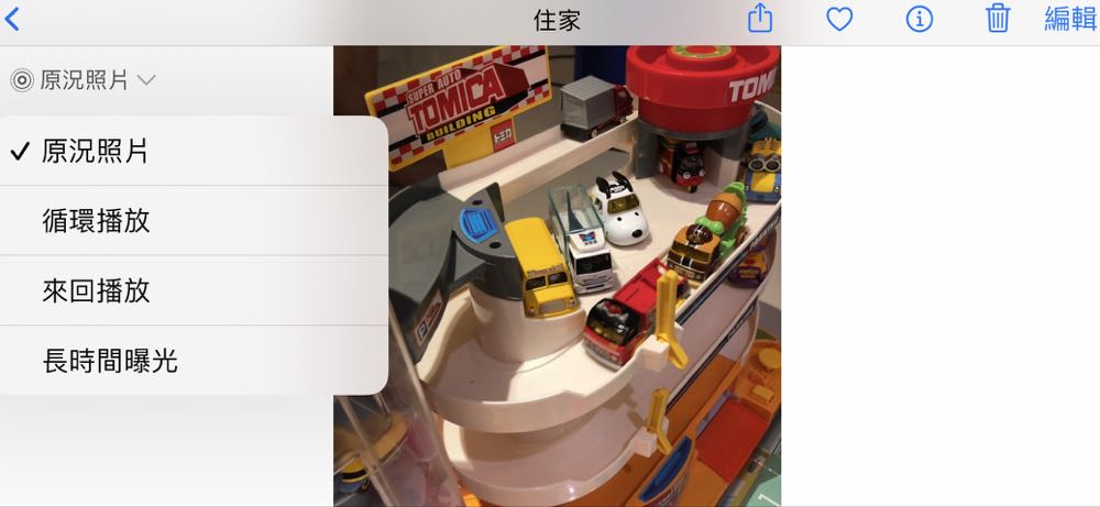 首先我們先使用「原況照片」來拍照,或是從相簿裡找出「原況照片」,接著拉開在左上方的「原況照片」下拉選單,選擇「長時間曝光」。