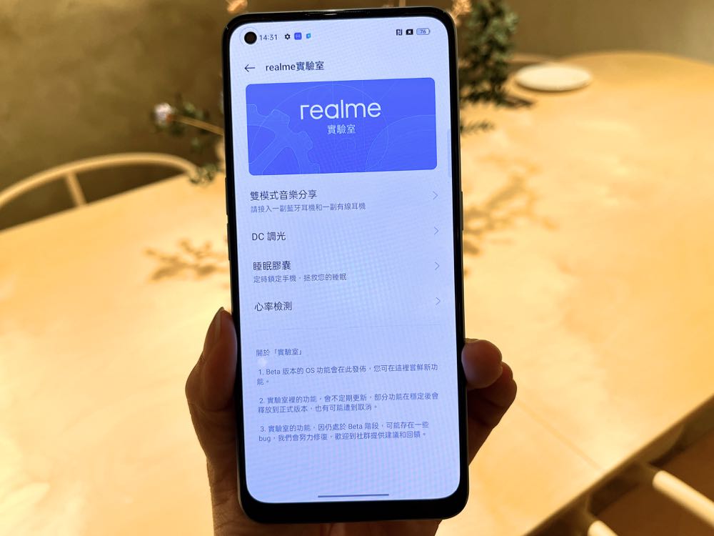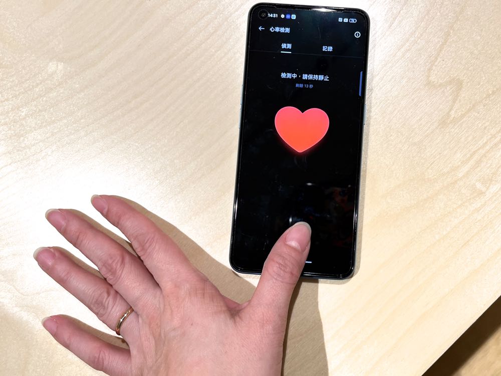 另一個很有趣的是,realme 9 Pro+ 有一個 realme 實驗室,會把 UI 中新的、還沒正式開放的功能先放在這裡。這邊我們也看到有一個「心率檢測」,是透過螢幕指紋感應系統,直接長按就能監測心跳!