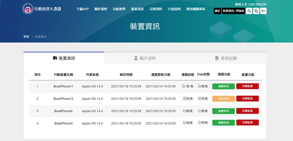 日後隨時可以在登入網站上方選項點選「 裝置資訊 / 停復用」查看自己有綁定的裝置,或是解除裝置。
