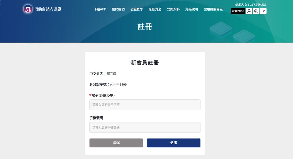 接著使用電腦登入「行動自然人憑證平台」(https://fido.moi.gov.tw/),選擇「立即註冊」>>> 插入自然人憑證實體卡後,輸入自己的身分證字號與 PIN 碼,電腦就會顯示專屬 QR code,這時再從手上行動裝置來使用 APP 掃描 QR code 後跟著引導完成生物特徵認證與驗證,註冊就完成了。
