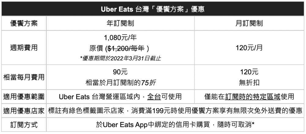 方案」月訂閱制即大量圈粉,現在 Uber Eats 宣布「優饗方案」啟動「年訂閱制」,除了訂單滿 199 元享無限次 0 元外送費優惠之外,全台 Uber Eats 營運範圍都能購買與使用。即日起至2022 年 3 月 31 日逐步推出「優饗方案」年訂閱制搶先購活動,活動期間內人人都有機會以 75 折優惠價(1,080 元)訂閱,相較於月訂閱制整年可省下 360 元。