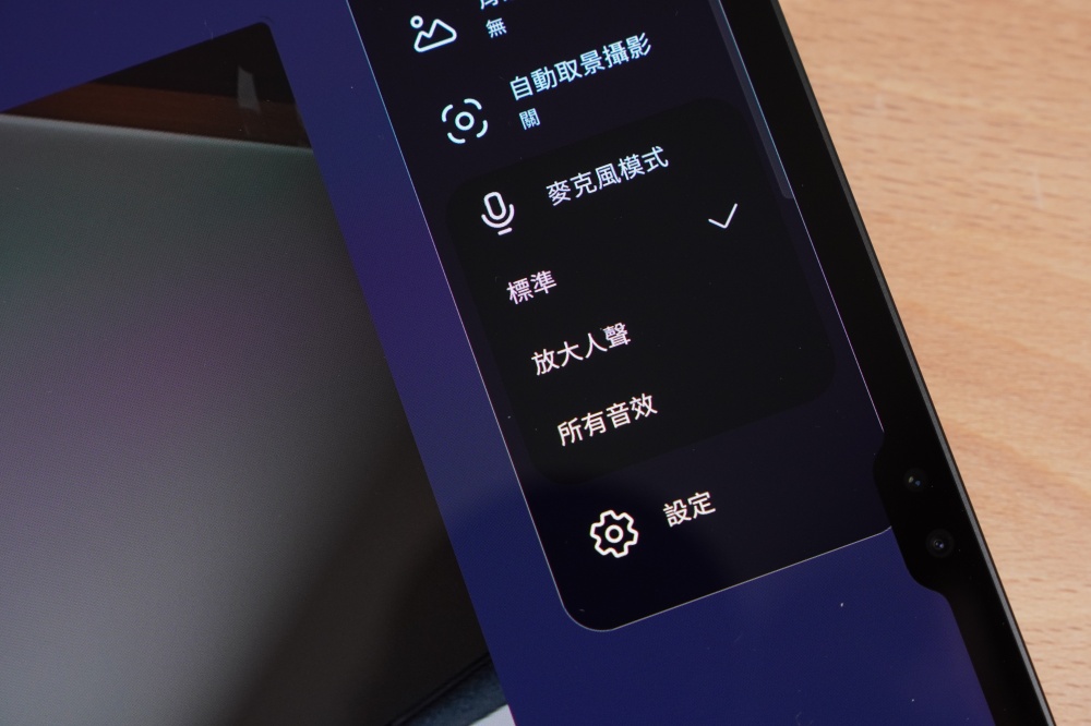 在設定的進階功能中,若有啟動視訊通話效果,在使用視訊軟體時就可以透過懸浮按鈕來調整麥克風模式,標準指的是輕微降噪、放大人聲可以強化人聲的清晰度、所有音效則是會收錄包含背景音的所有聲音。