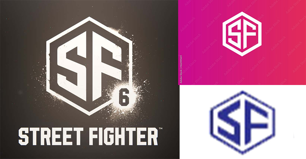 然而,光憑肉眼難以區分細節差異,若將 Adobe 圖庫的 logo 與《快打旋風 6》logo 圖層疊在一起比較,可以發現二者輪廓雷同,但細節上仍有些許差異,比如《快打旋風 6》logo 的六邊形框框的線條更纖細,「S」與「F」字體有可看出明顯的不同,甚至多了潑墨效果。