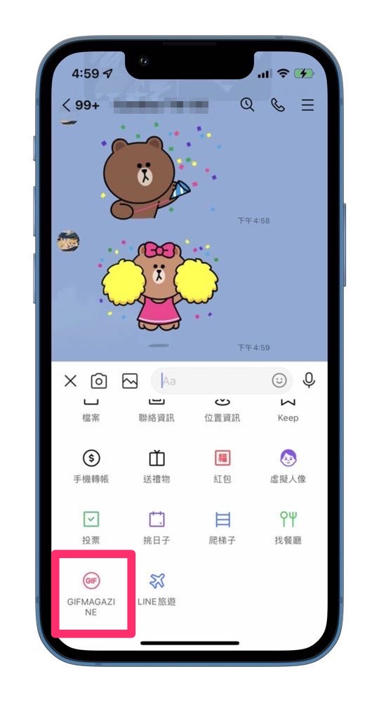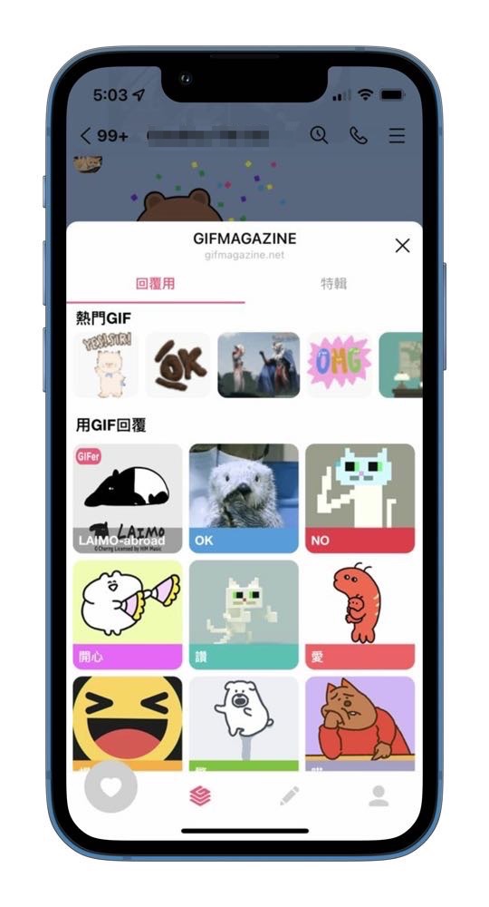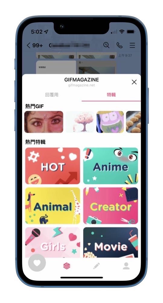 首先我們只要在 LINE 的對話視窗中點選「+」 後就能看見下方有個「GIFMAGAZINE」選項,第一次使用需要同意授權,之後就會看到「回覆用」與「特輯」兩種選擇。裡面都有著不同主題分類的 GIF 圖檔可以使用。