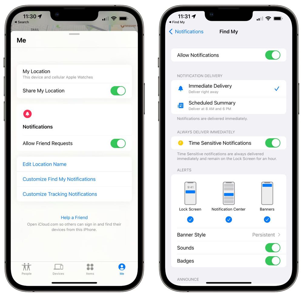 除此之外,用戶也能在更新到 iOS 15.4 後於「尋找」app 裡的「通知」項目加入「自訂『尋找』聲音」與「自訂『追蹤』通知」,以及設定的「通知」、「尋找」app 中來讓自己能夠馬上收到警告通知訊息!