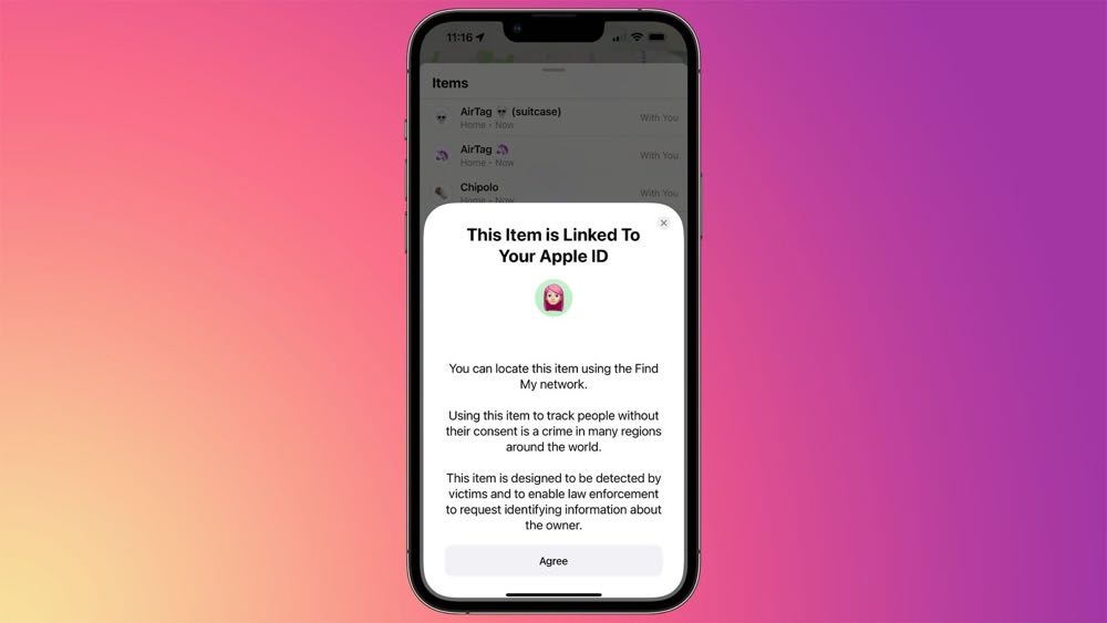 根據外媒《MacRumors》表示,iOS 15.4 Beta 4 版本裡為 AirTag 的設定加上一段「若沒有經過他人同意而追蹤他人是一種犯罪的行為」警語,以及若是有人利用這樣的工具進行不法的行為,Apple 將會提供該枚 AirTag 所有者身份資料給執法單位。