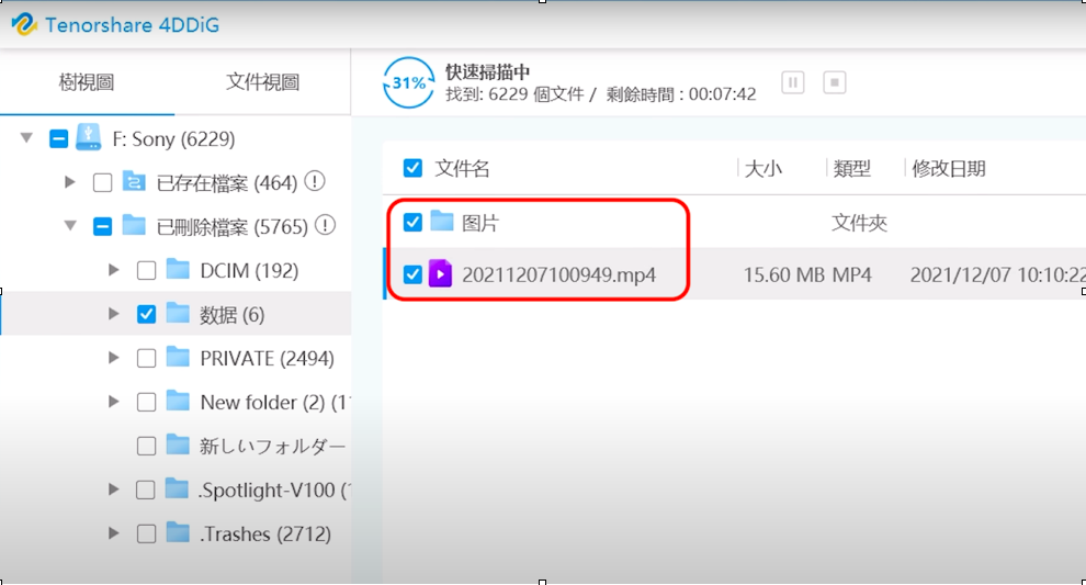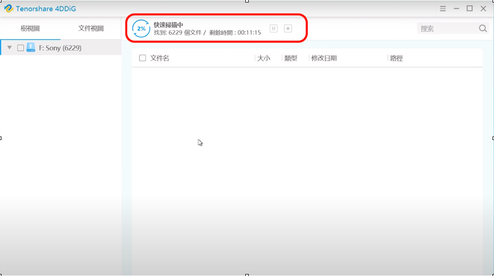 點擊「開始」後,【Tenorshare 4DDiG】 會立即檢測 USB 隨身碟上已刪除的文件,同時上方進度列也會顯示已經掃描的進度,檔案多時過程可能會花一點時間,近期刪除的文件則會優先找到。當 4DDiG 在驅動器上找到已刪除的文件時,它會根據樹視圖和文件視圖記錄掃描的項目,當欲救回的文件名出現後,你可以立即點擊螢幕右上角的「暫停/停止」按鍵停止掃描動作。