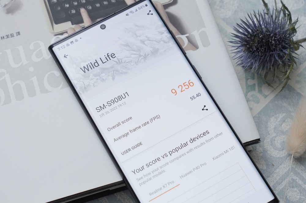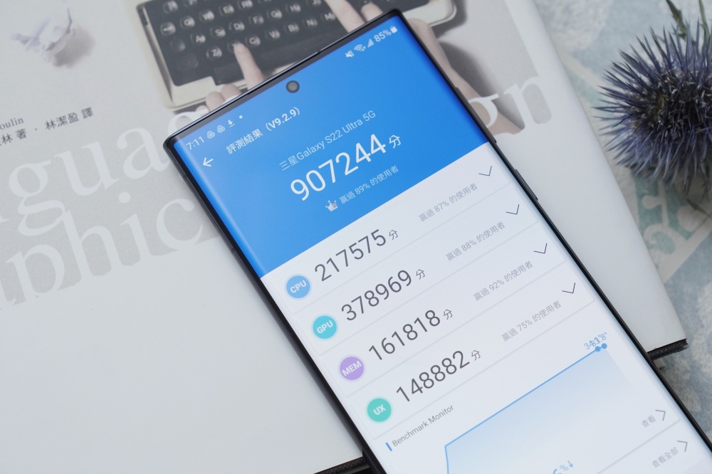 身為台灣首款上市、搭載高通 Snapdragon 8 Gen 1 處理器的機型,Galaxy S22 Ultra 的性能表現可以說是樹立了今年旗艦機的標竿,我們測試的機型為搭載 12GB RAM、256GB ROM 的版本,透過安兔兔測試輕鬆的就跑到 907,244 分的成績,不論是 CPU、GPU、MEM 或是 UX 表現都很優異。