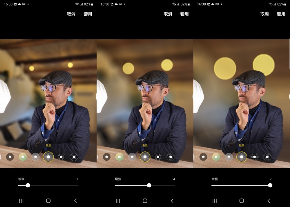 每一種人像模式特效都可以調整特效強度,以散景為例,當特效強度比較低時,背景點光源會是比較小的點,但隨著特效強度增強,背景點光源的光點也會跟著變大、散景模糊程度也會更強,使用者可以依照自己想要的感覺隨時調整。
