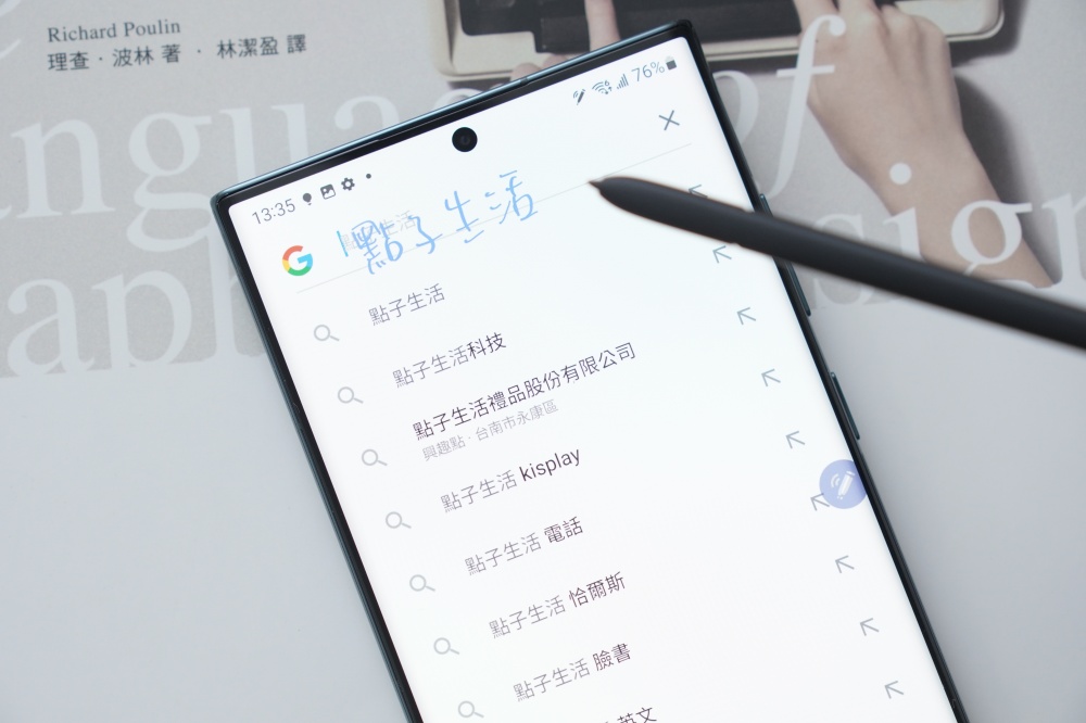 三星也在 Galaxy S22 Ultra 上加入多項 S Pen 的實用功能,比方說從設定中打開即時手寫筆跡辨識,這樣在像是 Google 搜尋框等過往要用鍵盤打字輸入的地方,現在可以直接用 S Pen 書寫文字,手機會即時辨識轉換成文字就可以搜尋。